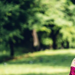 Portrait of happy beautiful asian arabic muslim woman with hijab dress relaxing.Young muslim girl smiling and look at camera on green park background